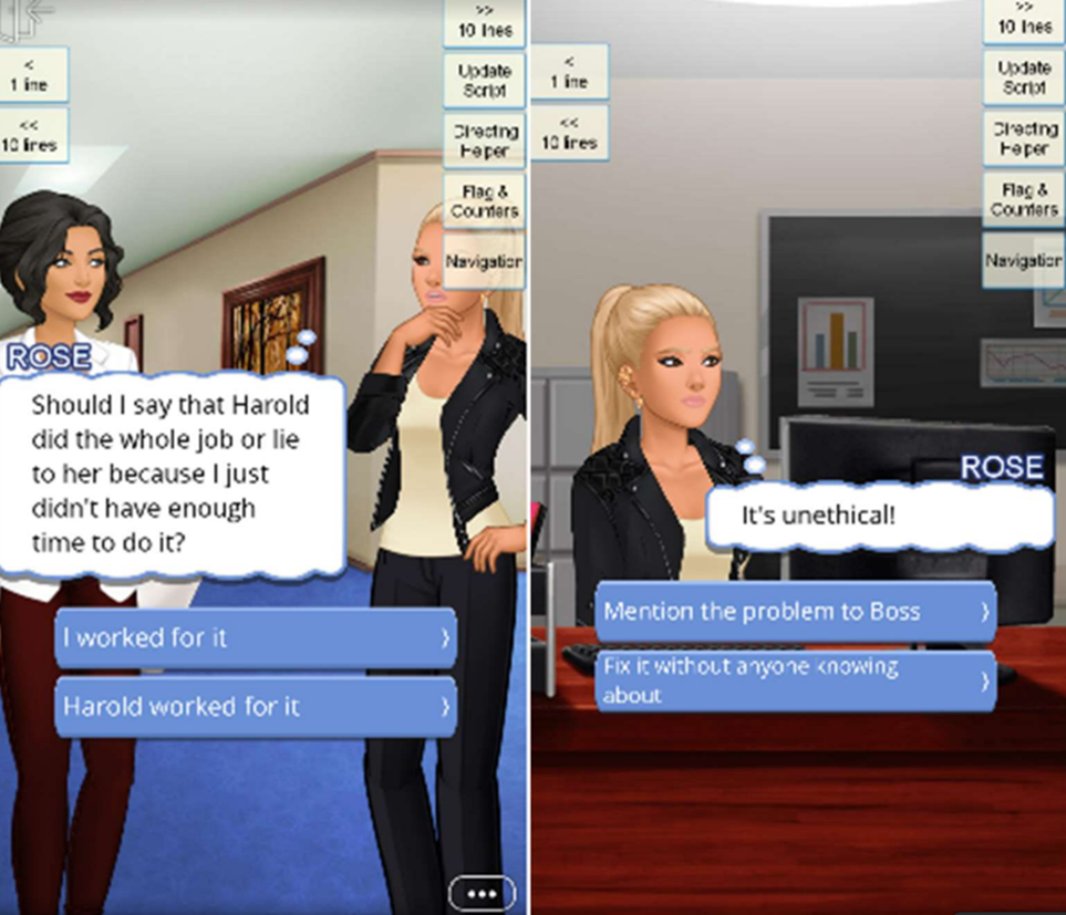 Ethical Dilemmas is a narrative-based game that introduces students to real-world ethical challenges in software engineering. Players follow Rose, a software engineer, through a week in the workplace as she encounters dilemmas related to confidentiality, professional responsibility, communication with clients, and corporate integrity. Each decision influences the storyline and leads to one of several possible endings.